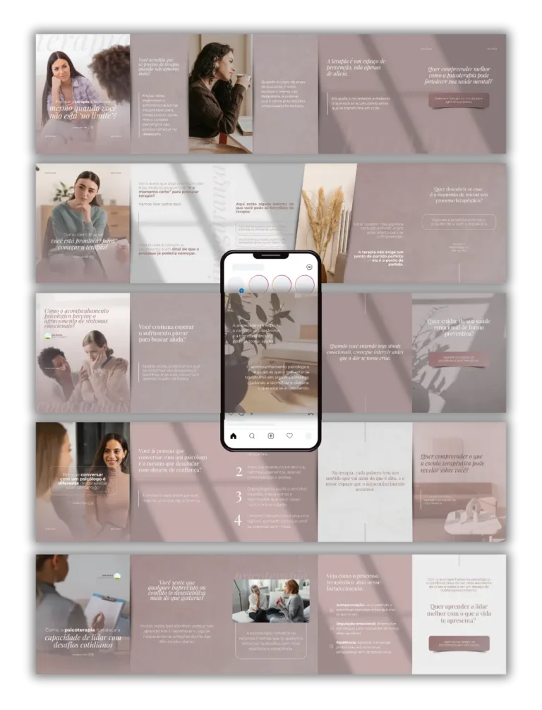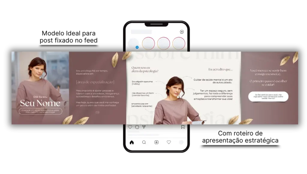 Apresente-se de forma estratégica e conquiste a confiança do seu público! São 4 modelos disponíveis no formato carrossel com roteiro envolvente, perfeito para fixar no topo do seu feed.