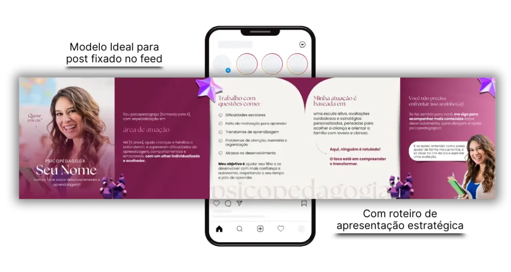 Apresente-se de forma estratégica e conquiste a confiança do seu público! São 4 modelos disponíveis no formato carrossel com roteiro envolvente, perfeito para fixar no topo do seu feed.